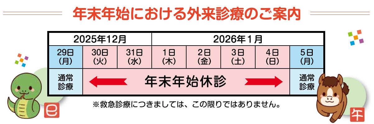 2025年末~2026年始の外来診療は、以下の通りとなります。ご理解ご協力をいただきますよう、よろしくお願い申し上げます。